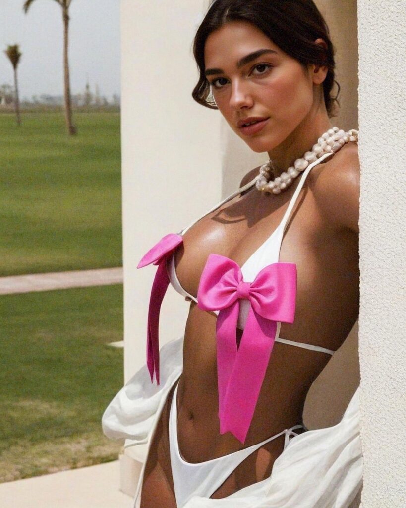 Dua Lipa just made the internet collectively gasp — again. This time, she did it not with a song, but with a single striking image. Dressed in a daring white bikini adorned with oversized pink satin bows, Dua poses under an arched terrace surrounded by vibrant bougainvillea. But this isn’t your typical vacation post — it’s something else entirely.