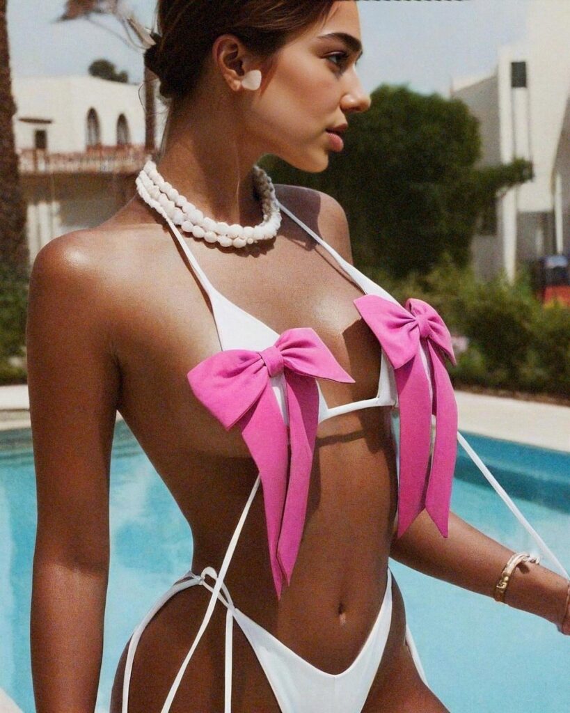 The look is both delicate and daring. The carefully tied bows draw attention, not just for their size, but for their color choice — pink often symbolizes femininity, romance, and rebirth. Paired with the bold cut of the bikini and layered statement pearls, this outfit says more than just “summer glam.”