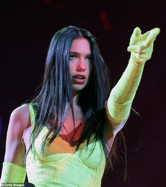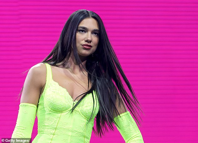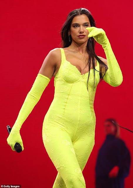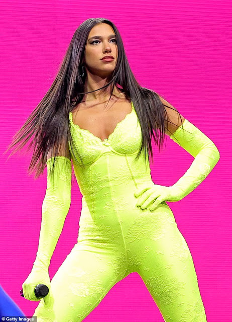 Dua Lipa put on a stunning display in a form-fitting neon yellow jumpsuit during her electrifying performance in Las Vegas for her highly-anticipated Future Nostalgia tour on a Friday evening. The eye-catching ensemble not only showcased her enviable figure but also featured a daring bra-style neckline, complemented by matching long gloves. The jumpsuit seamlessly transitioned into elegant heeled boots with a pointed toe, all while Dua confidently held onto her microphone. Maintaining her signature style, the singer let her sleek, black hair cascade down in a straight and shiny hairstyle, perfectly complemented by a glamorous makeup look that accentuated her flawless complexion, complete with a ruby lip that added a touch of allure.