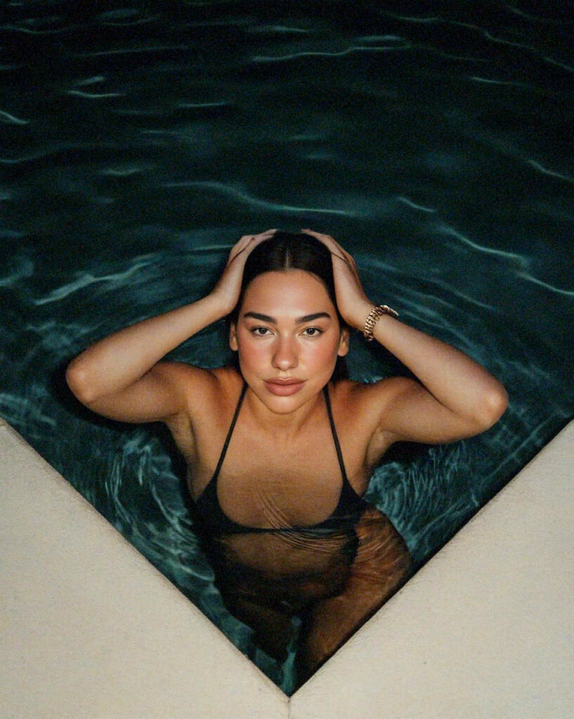 Emerging gracefully from the water, Dua serves effortless beauty with glowing skin, wet-look hair, and a smoky nighttime vibe. The photo, taken at the edge of a dimly lit pool, highlights her natural glow and signature confidence.