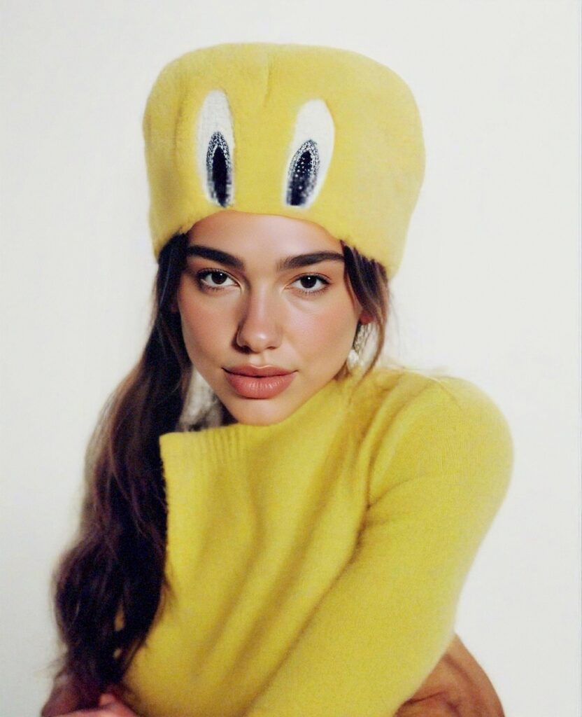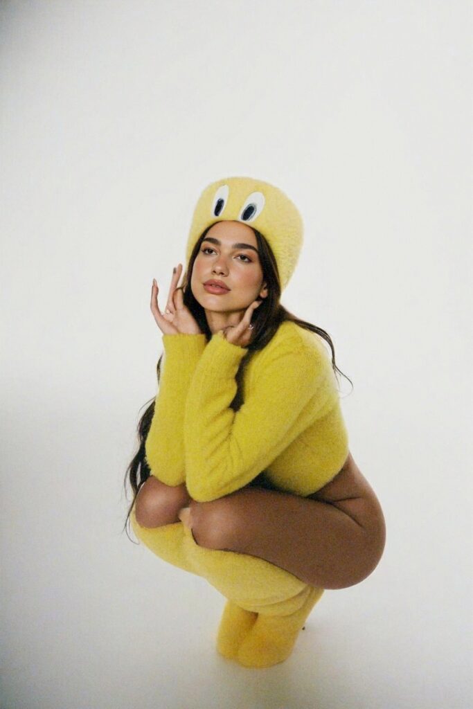 Dua Lipa is once again redefining pop star fashion—this time with a playful twist. In her latest photoshoot, the global icon channels Tweety Bird energy, rocking bold yellow tones, feathered textures, and sky-high confidence. The look immediately draws comparisons to Kylie Jenner’s iconic Tweety-inspired shoot, but Dua makes it entirely her own with a touch of retro glam and runway attitude.