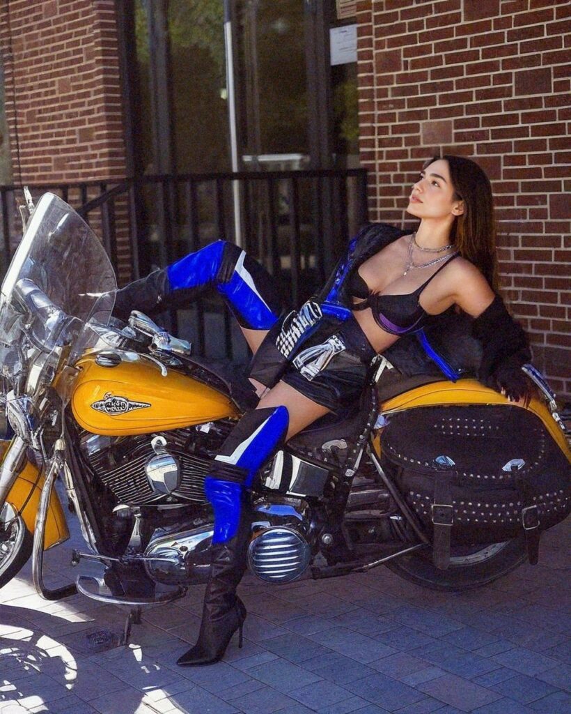 Dua Lipa doesn’t just ride — she dominates. In this electrifying look, she turns a motorcycle into a throne and transforms leather into luxury. From the deep violet undertones of her lingerie-inspired top to the electric pop of royal blue thigh-high boots, every piece screams confidence, danger, and sensuality.
