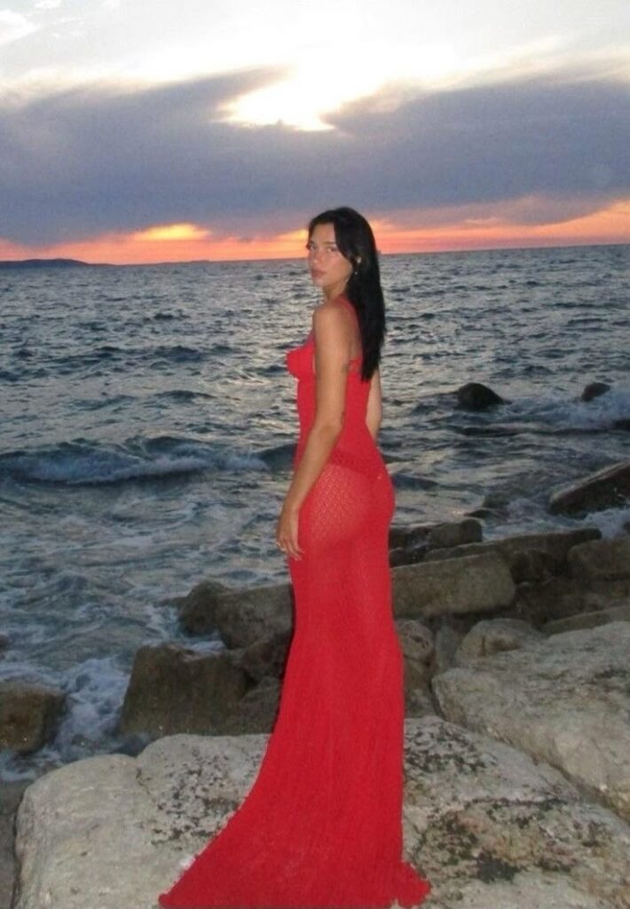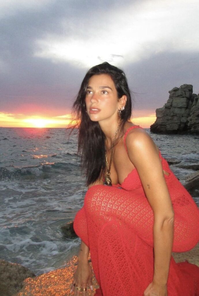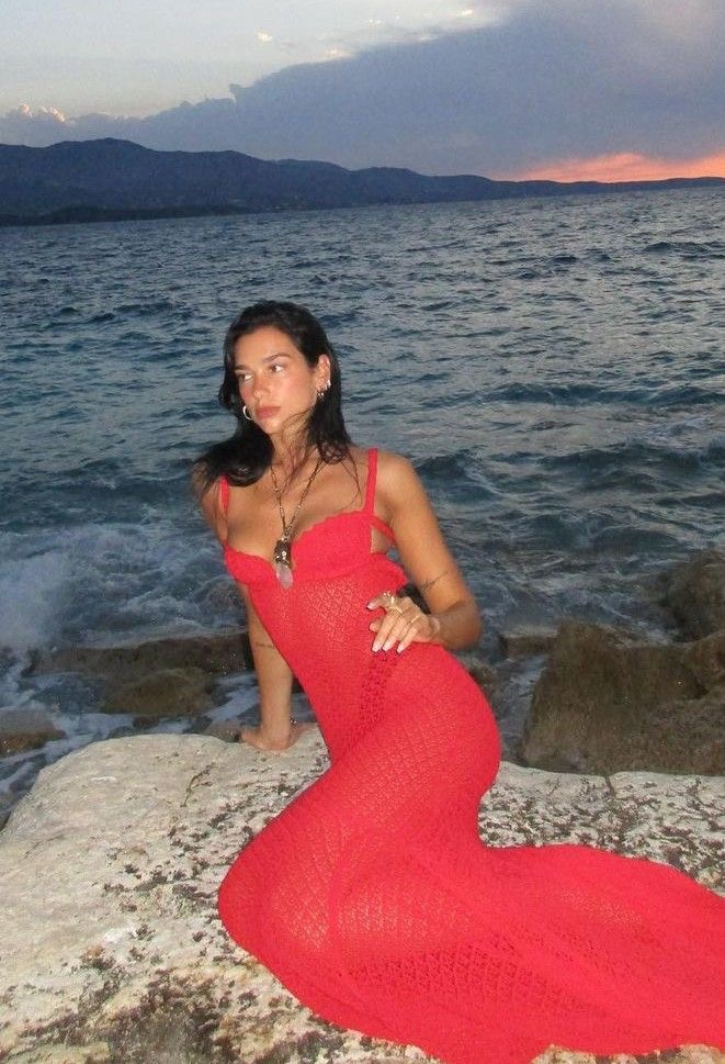 Dua Lipa proves once again that she’s the queen of effortless beach glamour. Captured against a dreamy sunset backdrop, the global superstar turned the coastline into her personal runway in a striking red sheer crochet dress that hugged her curves to perfection.