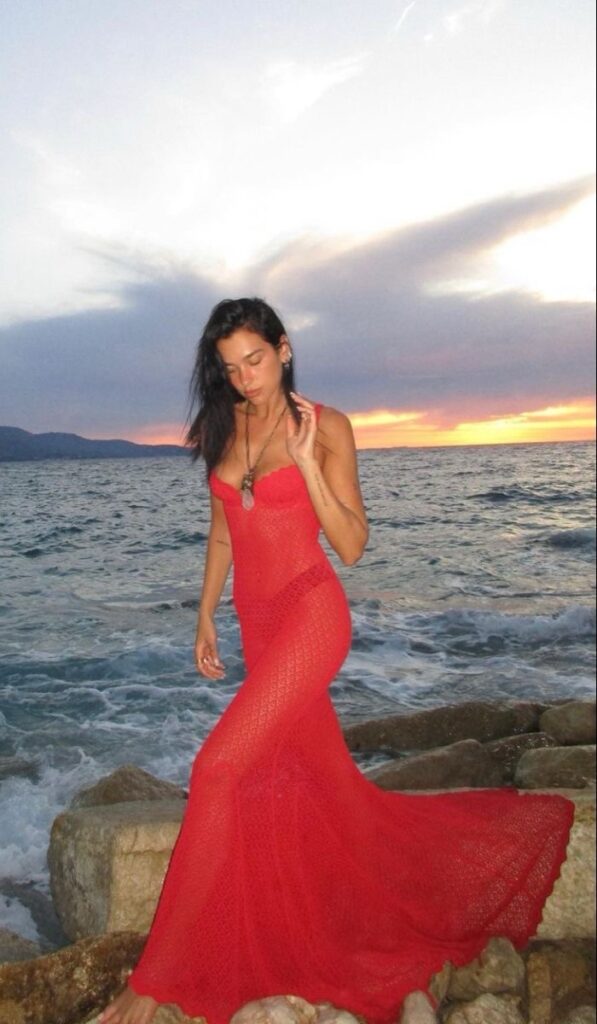 Dua Lipa Sets the Shoreline on Fire in Bold Red See-Through Dress