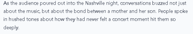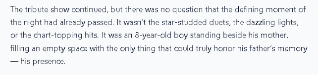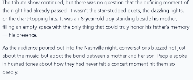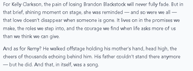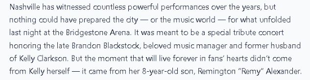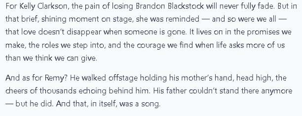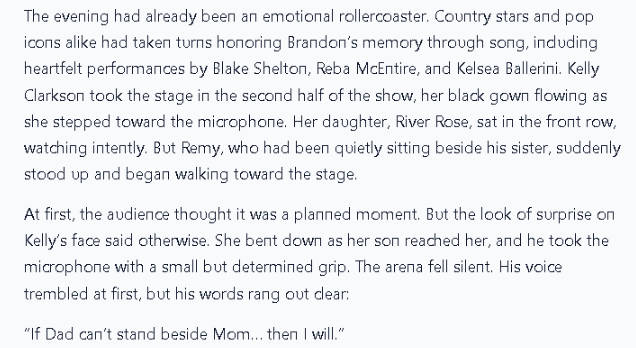 Backstage after the performance, Kelly spoke briefly with reporters, her voice stil shaky but filled with pride. “He wasn’t supposed to do that” she said with a soft smile. “But that’s Remy. He’s got his father’s courage and his own big heart, | think Brandon would be so proud.”