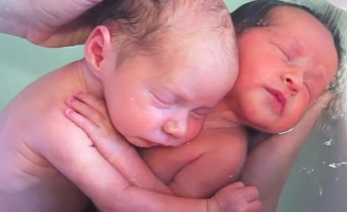 It is not surprising that twins will remain close even after birth, and some newborns will want to be next to their twin as much as possible because it is what they remember. This was true for a pair of newborn twins who received a special bath a few days after birth and could not stop cuddling and holding one another while they enjoyed the water.