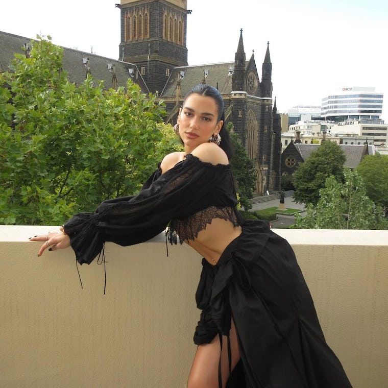 For an afternoon of sightseeing, Dua slipped into an editorial Ann Demeulmeester outfit that some might reserve for fancier events like a premiere or red carpet. (Dua wore hers to pose atop a building). The singer’s look consisted of an off-the-shoulder crop top and matching skirt that featured a high-low silhouette.@plugseven