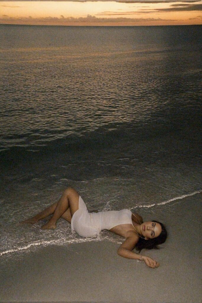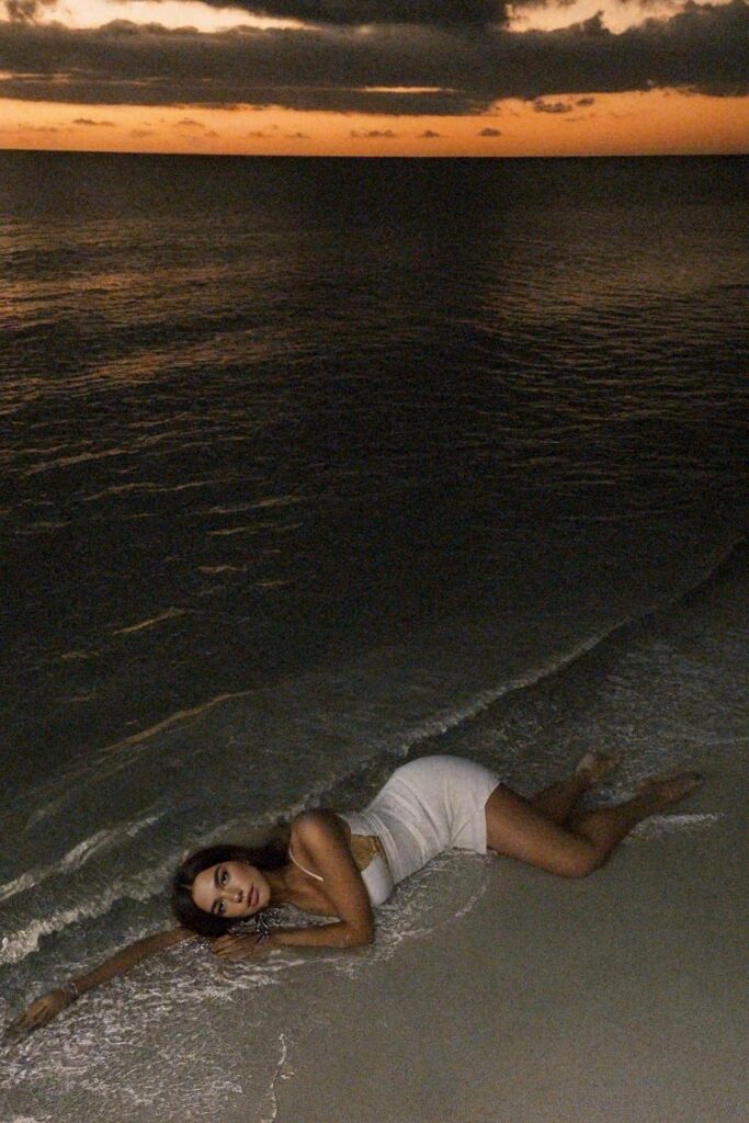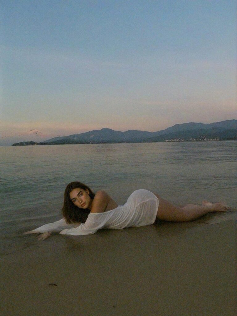 As the last light of day brushes the horizon, Dua Lipa delivers a quietly powerful moment — dressed in nothing but a sheer white dress and the calm of the sea. Captured in a pose that’s as still as the ocean around her, this photo is more than fashion — it’s mood, it’s presence, it’s visual poetry.